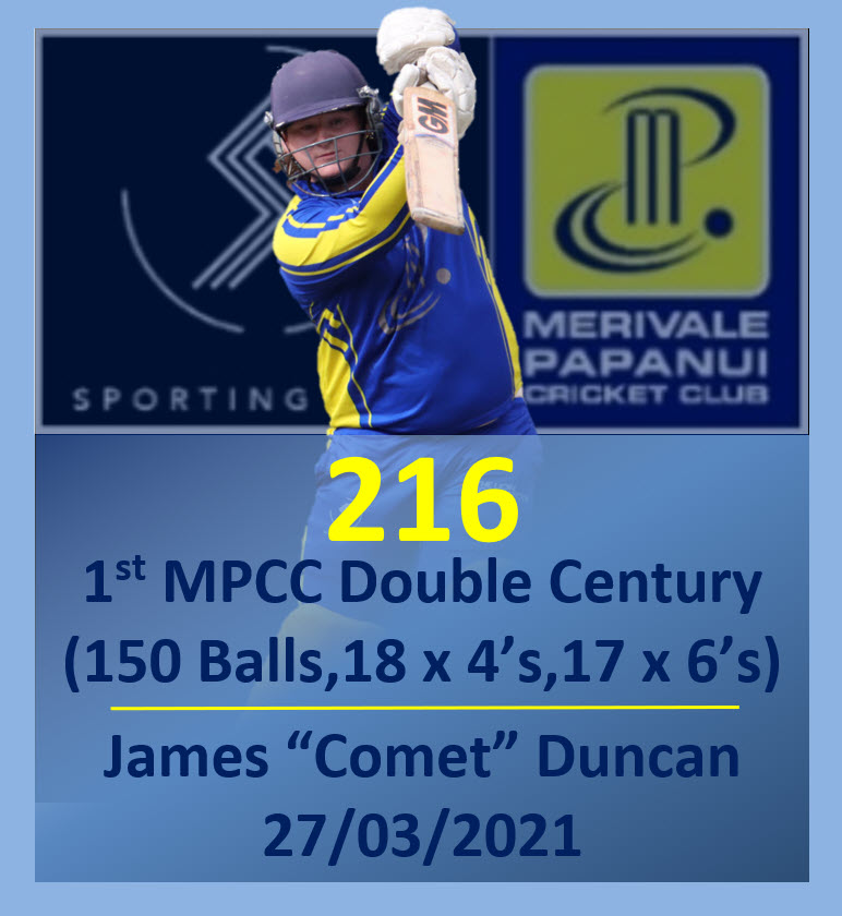 Huge congratulations to current MPCC Club Captain and skipper of the MP Sporting Edge Div.1 2nd XI, James "Comet" Duncan who etched his name into Merivale-Papanui Cricket Club folklore Saturday by scoring the clubs first ever Double Century on the last day of the season against Sydenham at Sydenham Park 2. Comet who debuted for the club in 2013/14 had never scored a hundred and made sure his maiden effort was a very special innings indeed scoring 216 off 150 balls (including 18 x 4's & 17 x 6's) and sharing in a 4th wicket partnership of 248 with Jonathan Collins who scored 36 (94) as they set up a score of 284/5 dec in the 2nd innings against their opponents. Comet's innings surpassed the previous highest score by an MPCC batsman of 180 which had been set by Darren Leigh in 2017/18 against St Albans. All in all a fantastic and very special knock by Comet and one that won't ever be forgotten by the man himself or those that were lucky enough to witness it!!